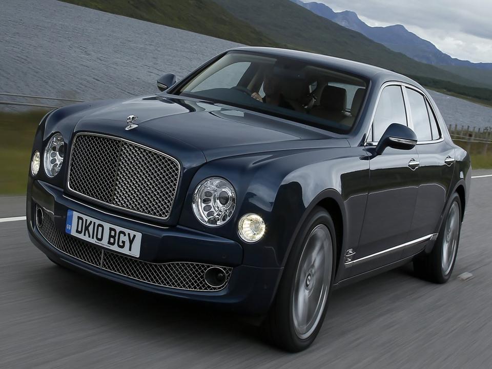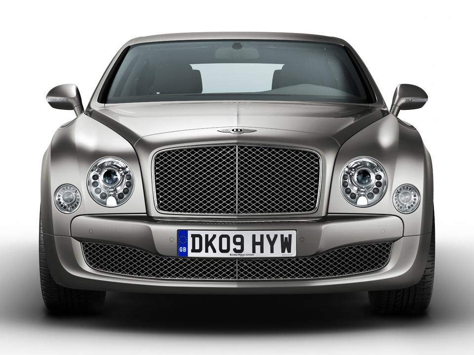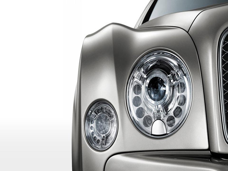 The Mulsanne features bold front end styling dominated by the traditional Bentley matrix grille and prominent round projector headlamps with chrome surrounds embossed with the Bentley name.