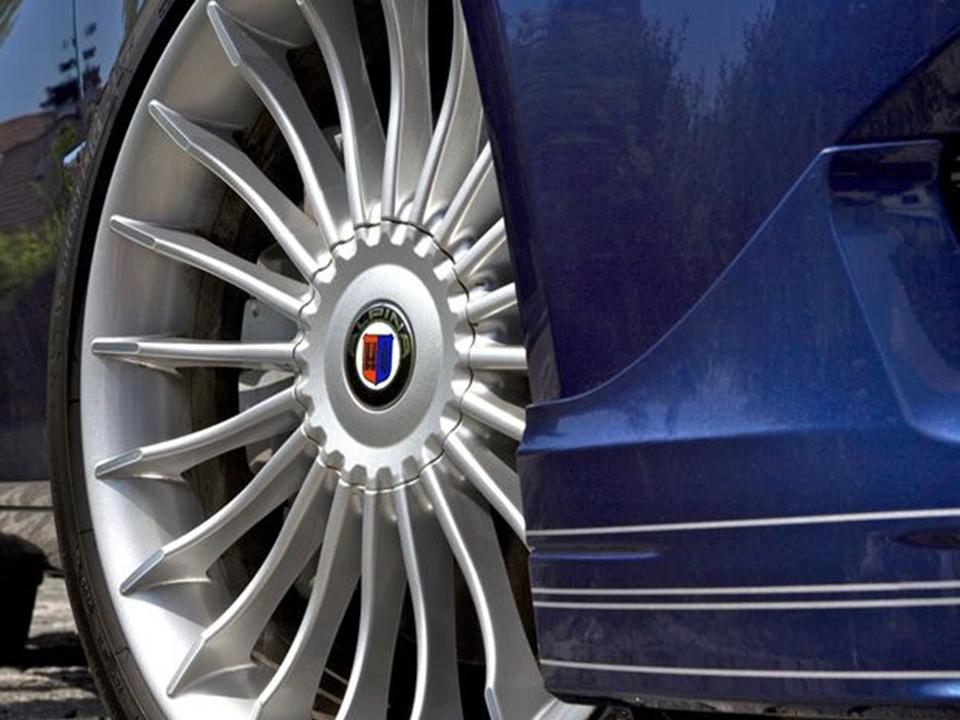 The flawless Crystalline blue finish and the signature 21” Alpina Classic wheels grab the eye first. The turbine-like three-dimensional curves gracefully guide each of the 20 spokes from the center of the wheel to the milled rim. The look of the wheels constantly changes with speed and rotation……the light hitting the spokes viewed from different angles is spectacular!