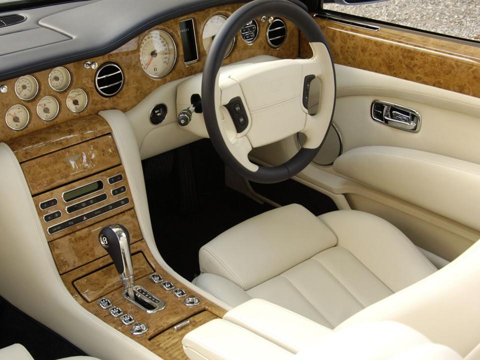 The Azure T has a muscular physique inspired by the 1955 Bentley Park Ward Drophead coupe and the 1995 Azure. Its roofline gives the car a sporting profile when raised with its seven bow canvas roof. With the roof raised, the cabin is hermetically sealed from the elements. When seated inside with the top up, it mocks a hardtop as no convertible hardware is visible. The convertible top is three layered, when lowered, it is stored in its own locker beneath the rear parcel shelf and takes only 2.5 seconds to close. The convertible locker doesn’t intrude into the boot integrity. It can still carry two sets of golf clubs and luggage easily.