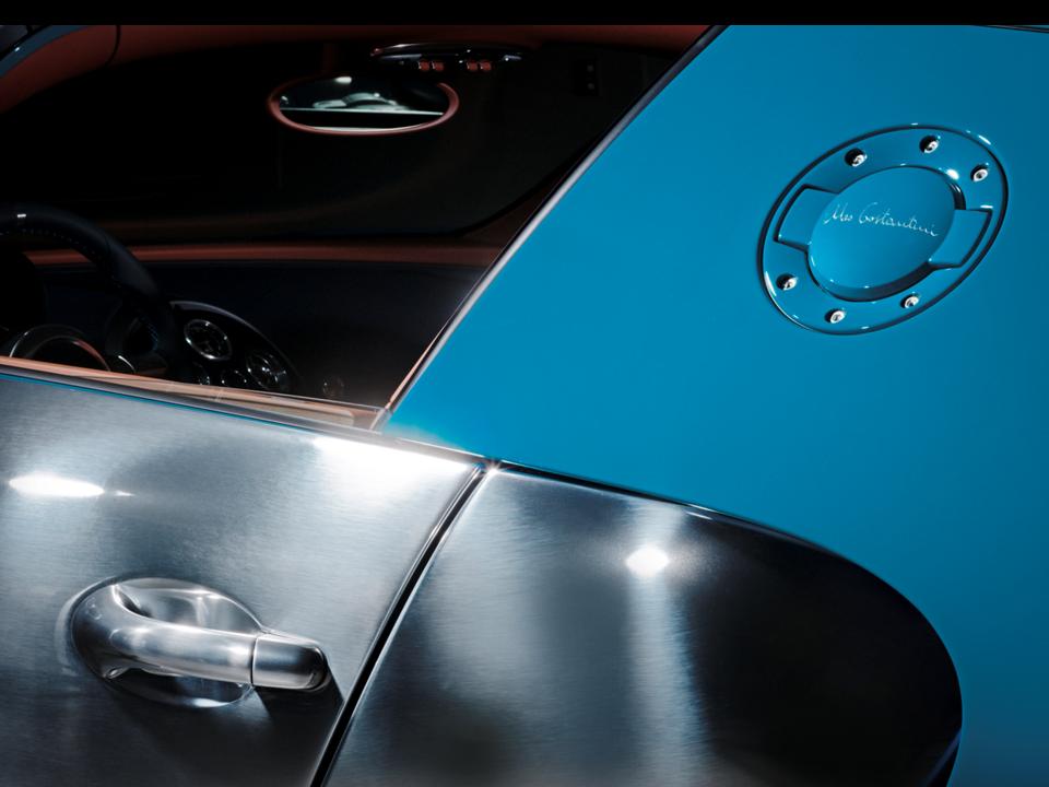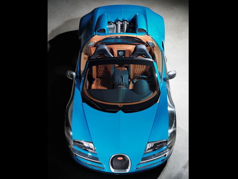 Specially developed “Bugatti Dark Blue Sport” finishes the carbon-fibre bodywork of the Veyron 16.4 Grand Sport Vitesse. Aluminium accents are polished and clear-coated, of which Bugatti is the only auto manufacturer to offer. It is a spectacular display of color as light glints from the blue paint contrasted by the aluminium touches. The color references France’s classic motor sport color and the Bugatti Type 35.