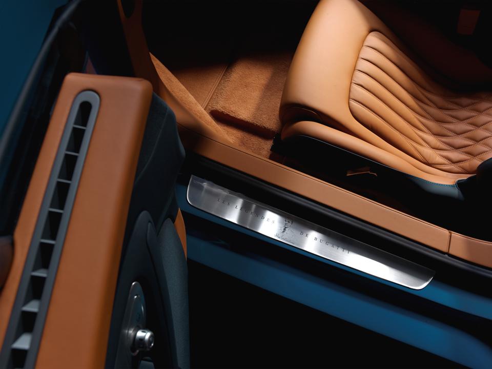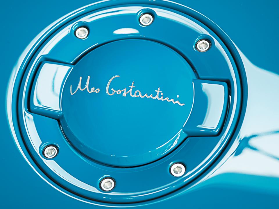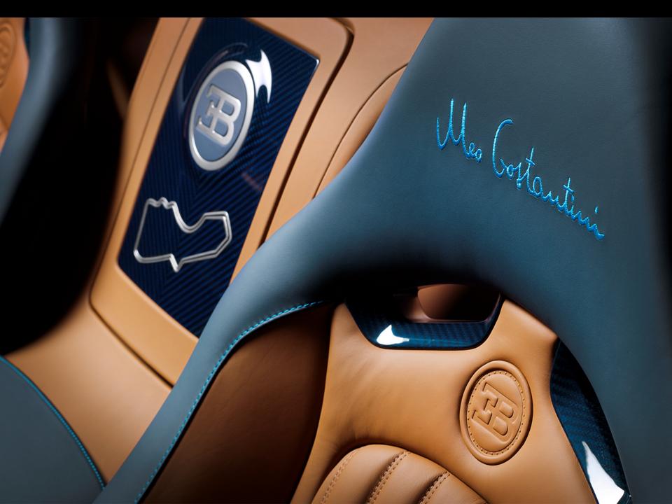 The interior is a symphony of blue tones highlighted by a color Bugatti calls “Gaucho” which is a cognac color. Gaucho accents the roof headliner, footwell, center section of the seats and the rear wall. Lake Blue accents the seat’s side cushions, arm rests, center console, door panels, dash and steering wheel. The contrasting stitching of the leather is in Bugatti Light Blue Sport. The head restraints are embroidered with Meo Costantini’s signature in Bugatti Light Blue Sport.