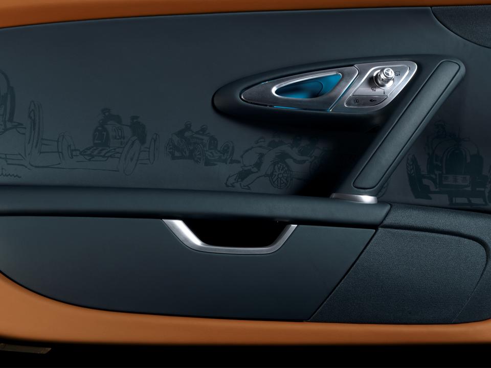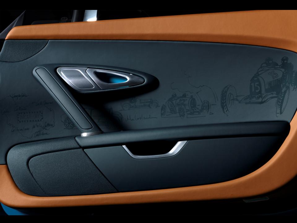 Behind the seats is a silhouette of the Targa Florio race route. The silhouette is done in a milled and polished aluminium motif directly below the EB logo on the cover crafted from dark blue clear-coated carbon-fibre. My favorite is the racing scenes and vintage car motifs on the doors; they are laser imprinted into the leather trim. Bugatti Light Blue Sport graces the door pockets and handle coves.
