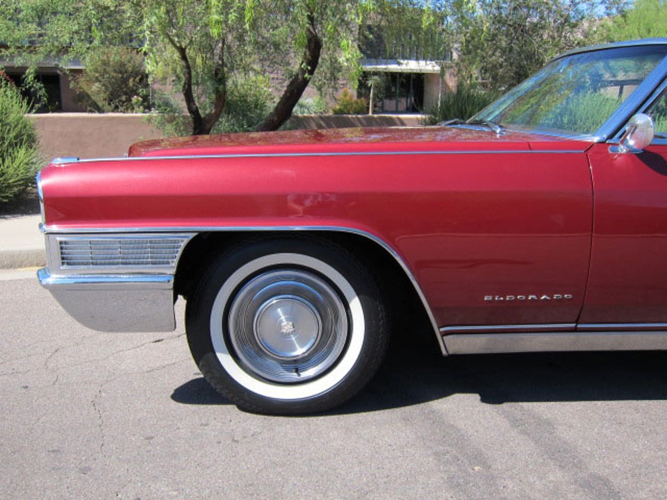The 1965 Fleetwood Eldorado convertible wore this new bodyshell very well. With its standard power fully automatic folding fabric roof in the open position, this sleek convertible was one dramatic, low-slung sweep from nose to tail. It was crafted to be the finest expression of open touring. Its individual styling and its dramatic and exclusive appointments made the Fleetwood Eldorado a motorcar of distinction.