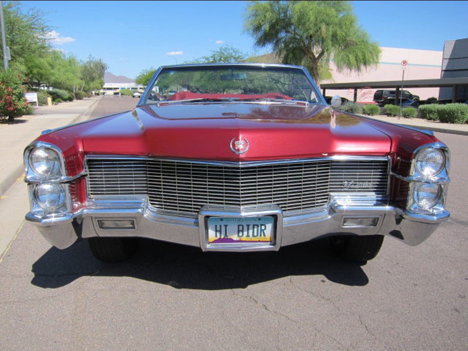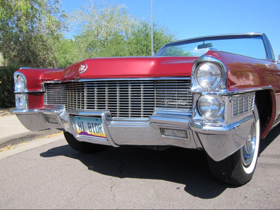 The 1965 Cadillacs were completely re-designed. They had an all-new longer and lower silhouette. New front end styling included the handsome vertical stacking headlamps and a wide mesh-like grille. The hood and front fender design were unique and individual, the fenders had their own design which traveled past the architecture to make a dramatic statement. The sculpted hood accented the new overall lower design of the body work elegantly. Chrome spanned the entire grille and bumper areas luxuriously. This all-new design was bold and contemporary yet unmistakably Cadillac.