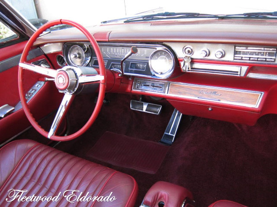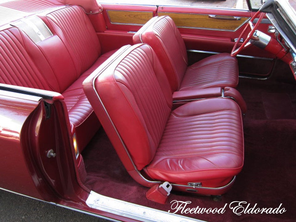 The 1965 Fleetwood Eldorado convertible came standard with an interior of supple natural grain leather hand stitched by the artisans at Fleetwood. A sandwich type sound barrier was applied between engine and passenger compartment along with sound deadening materials that absorbed noise. Each side of the cowl area inside received a rubber compound sound barrier. The floor boards received two layers of jute topped by deep carpeting, over a rubber compound sound barrier. This was an extra quiet ragtop.