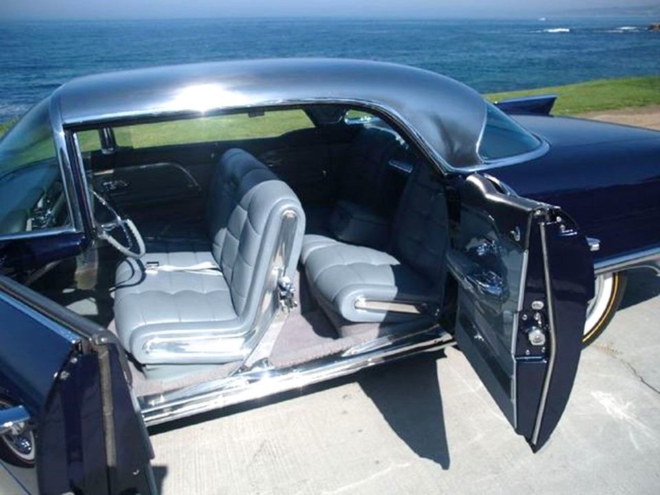 The futuristic Elmiraj has an interesting interior valet feature. For ease of entry to the rear passenger compartment, the appropriate front seat moves forward 10 inches with the rear seat moving forward 4 inches. The 1957-1958 Eldorado Brougham featured a similar feature, when either rear coach door was opened the front seat automatically moved forward. A high-res screen is directly behind the instrument gauges that displays driver information.