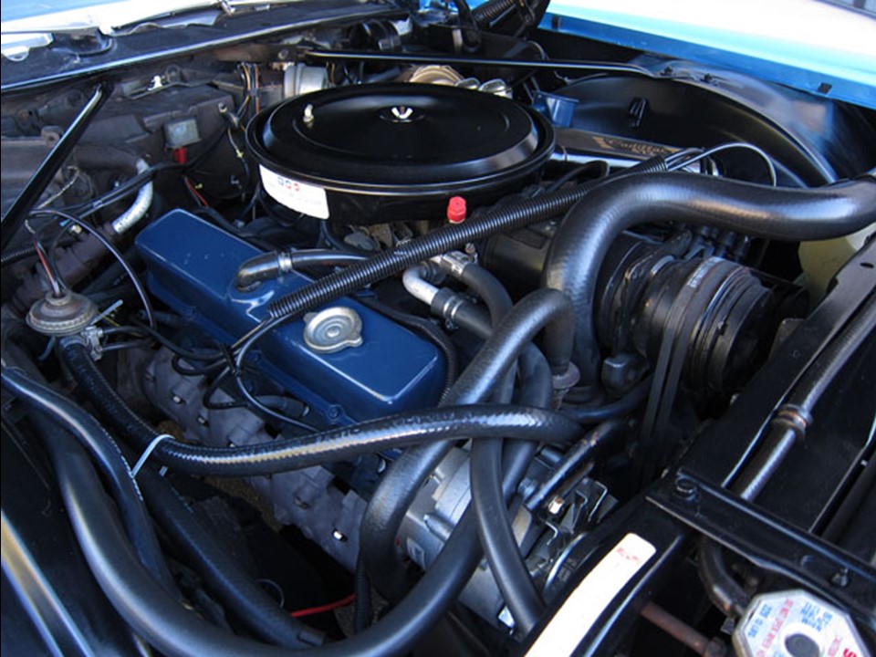 It was equipped with a Rochester 4-bbl downdraft Quadrajet carburetor with equalized manifold, mechanical fuel pump, dry-type air filter, improved automatic choke, and AIR (Air-Injection Reactor) system to reduce hydrocarbons in exhaust.