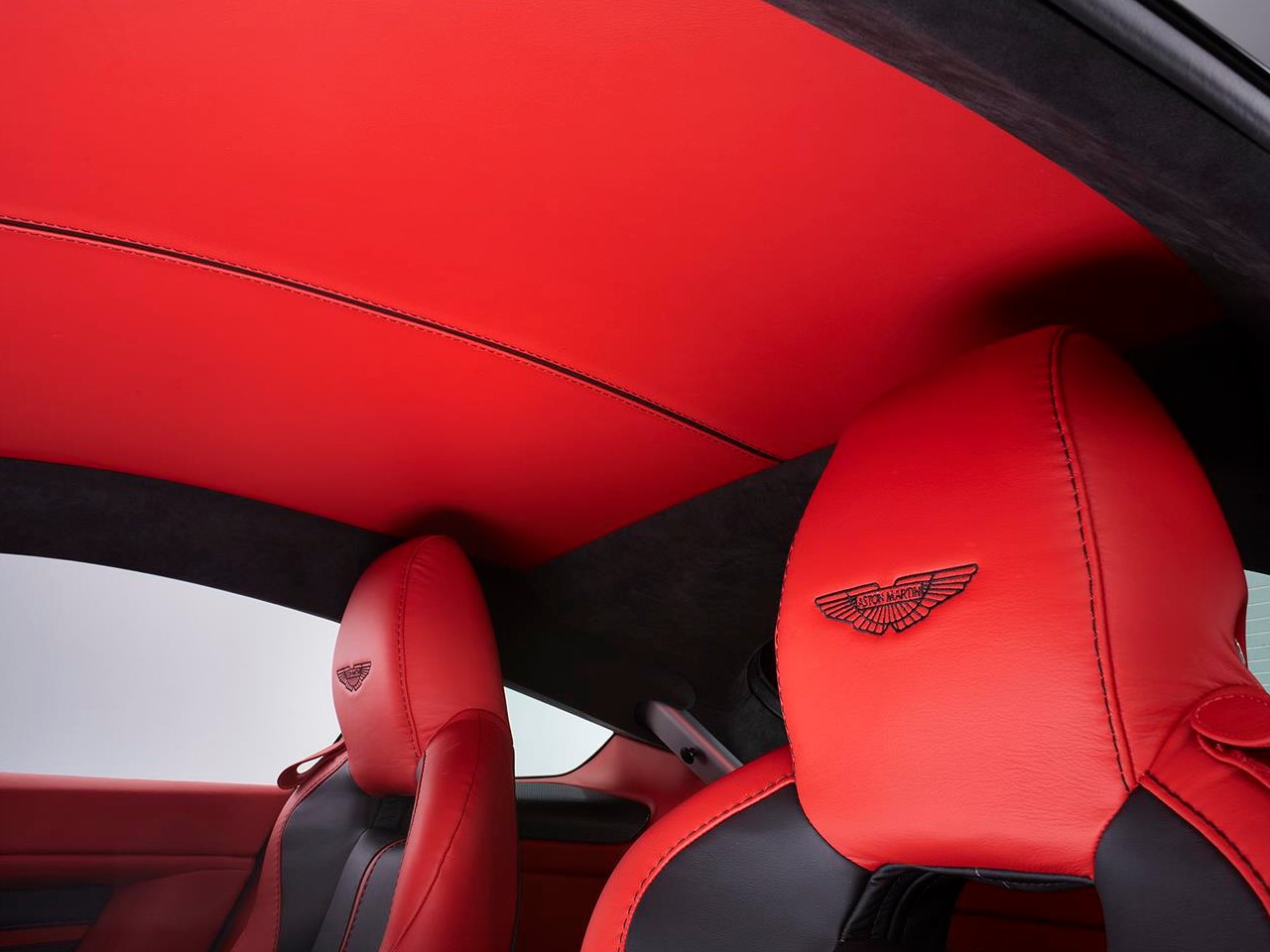 The cabin is an inferno of color. The fire-red mingling with the black accents looks like flame activity. At any angle one may see the sophistication of the hand-stitched laser-cut leather augmented by French seams in a contrasting color. The elegant Aston Martin center stack is trimmed with the fancy tinted exposed carbon-fibre with the look of molten lava…vision is still held captive-