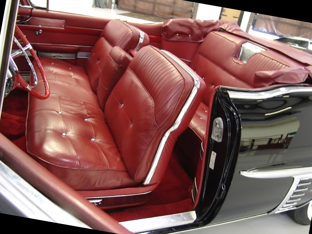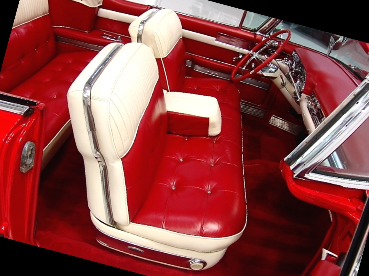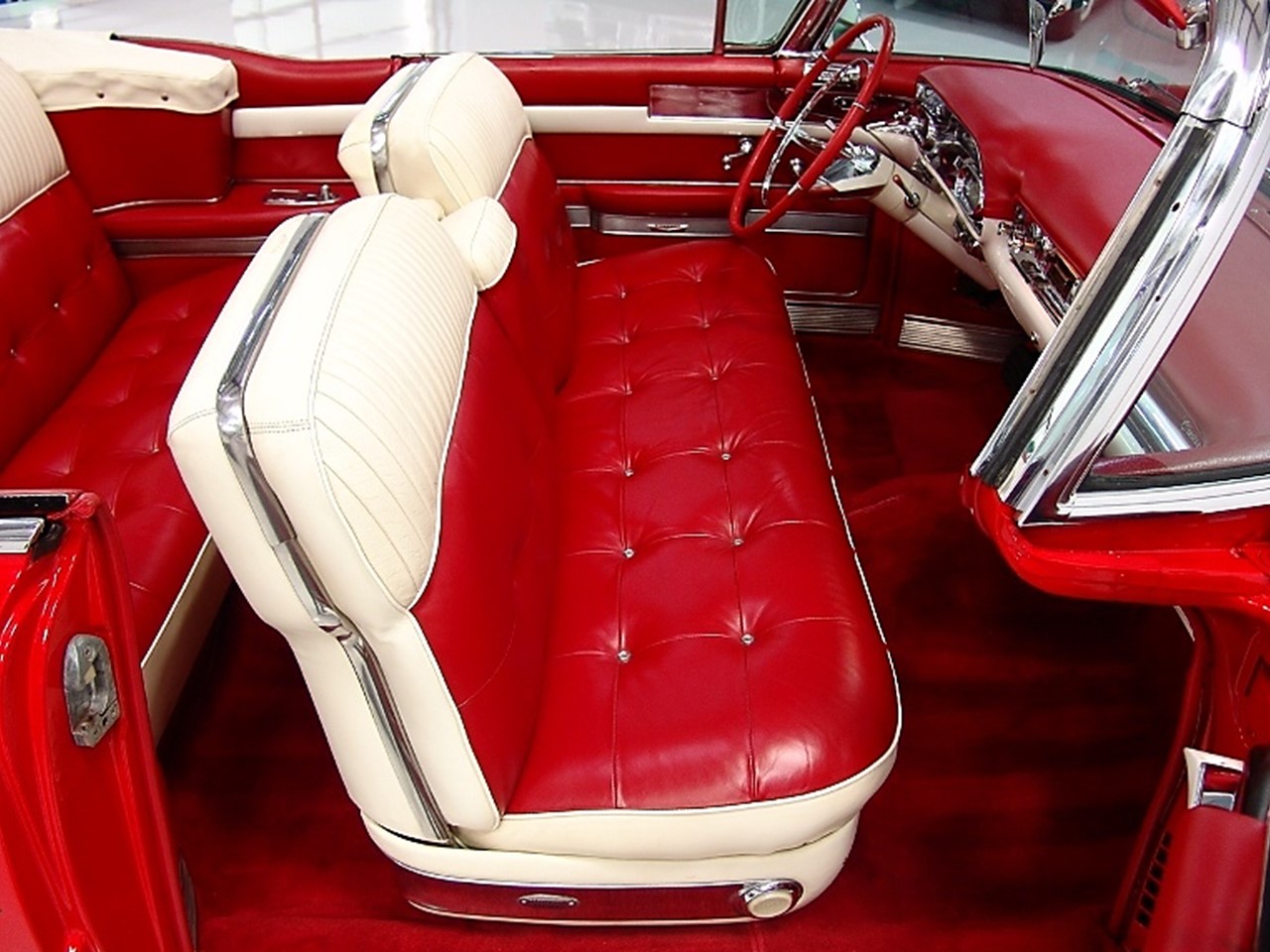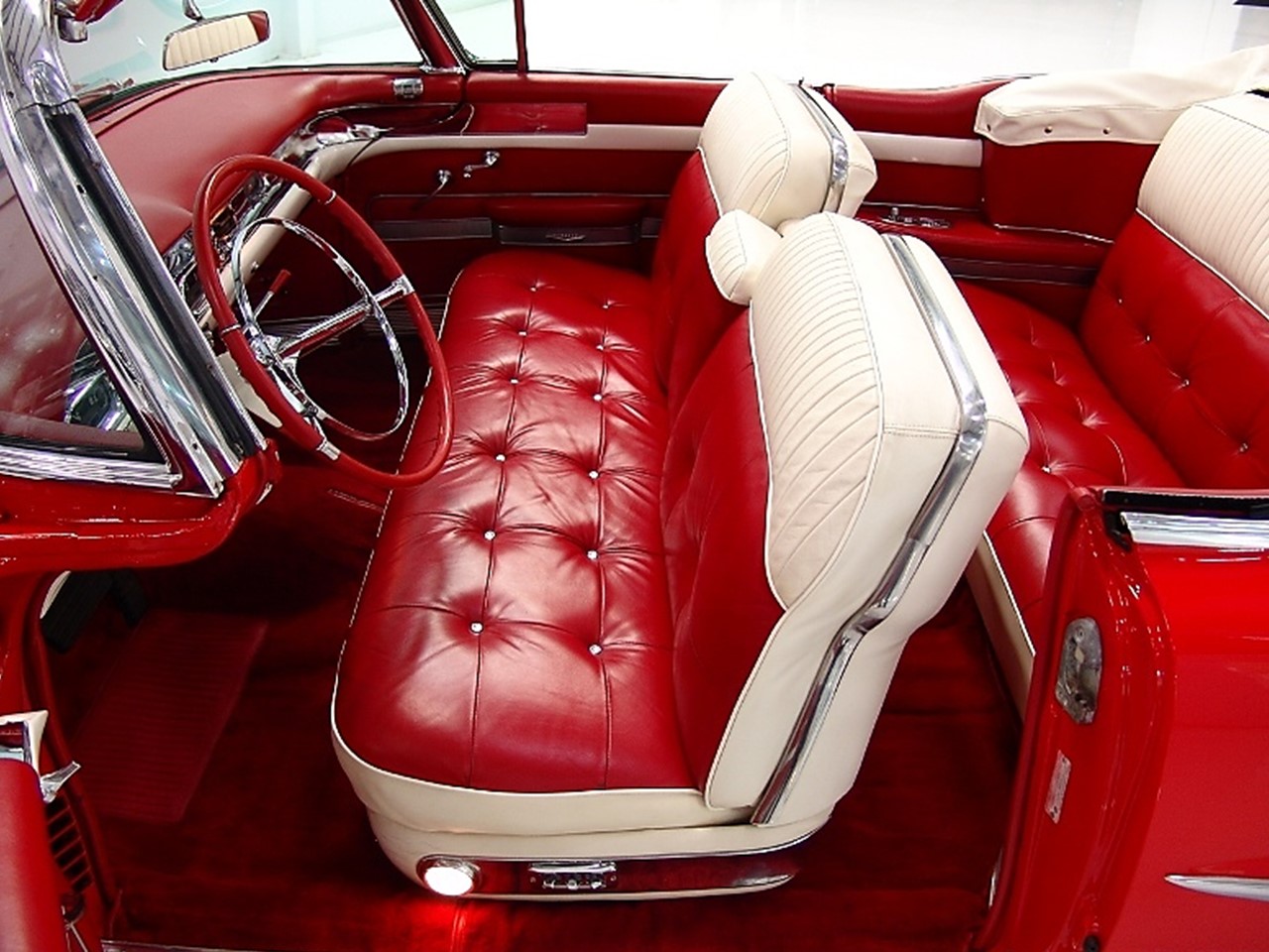 The 1957 Cadillac Series Sixty-two convertible came standard with a fully leather upholstered interior by Fleetwood. The seat backs and seat cushions had intricate hand button tufting in a ‘biscuit’ motif. The upper portion of the seat backs used a corded leather piping in a contrasting color.