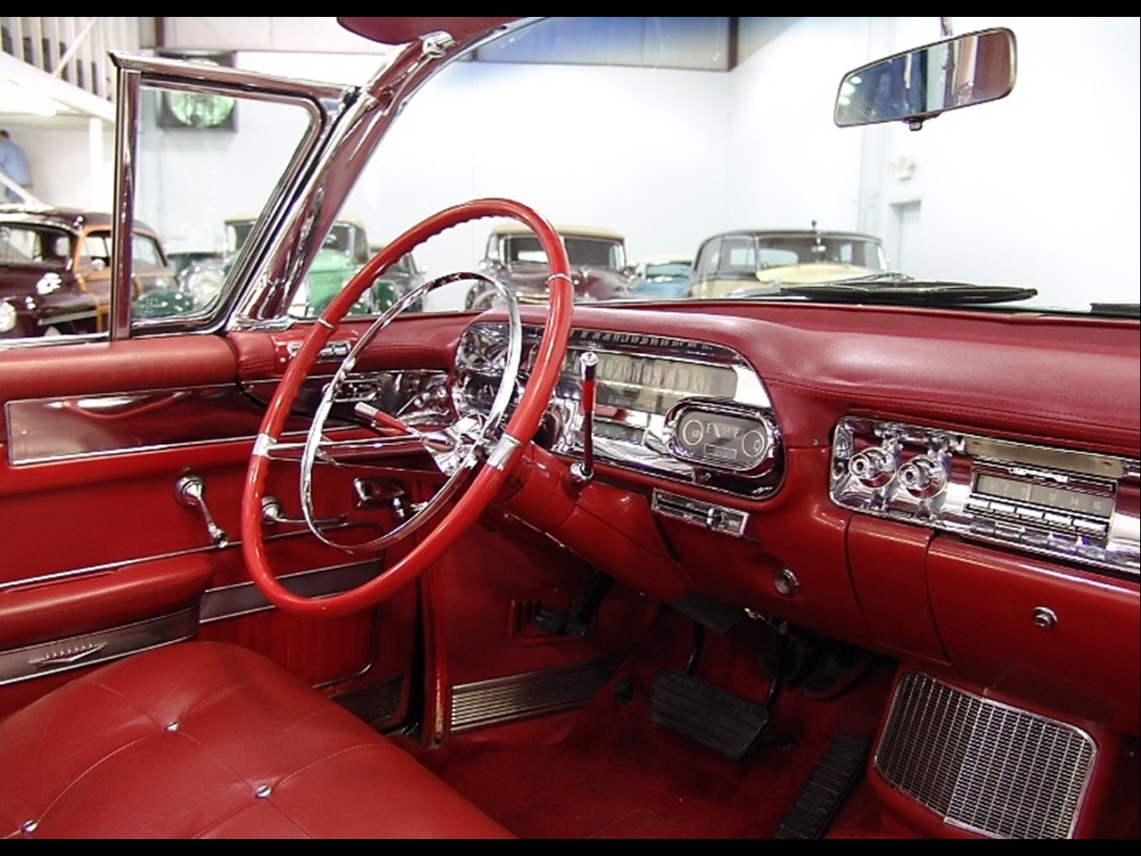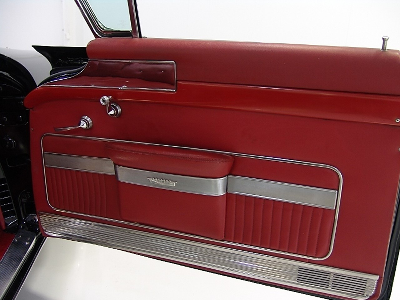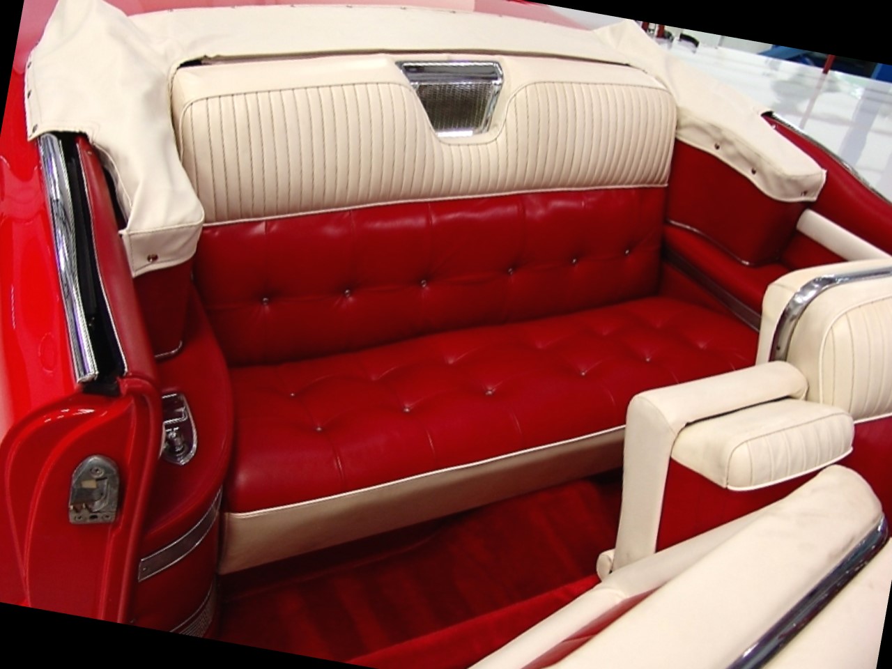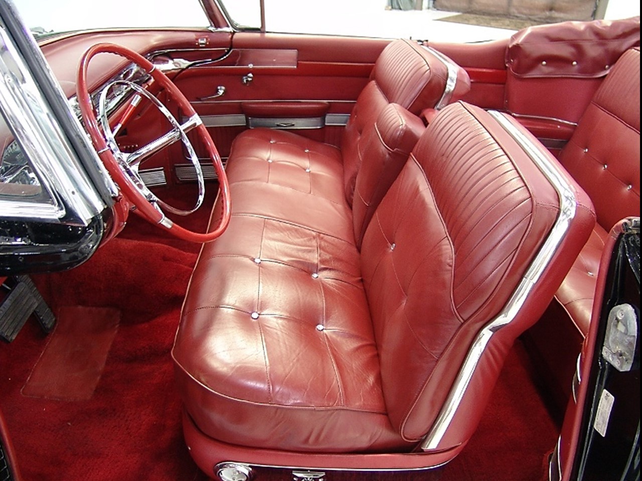 The 1957 Cadillac Series Sixty-two convertible came standard with a fully leather upholstered interior by Fleetwood. The seat backs and seat cushions had intricate hand button tufting in a ‘biscuit’ motif. The upper portion of the seat backs used a corded leather piping in a contrasting color.