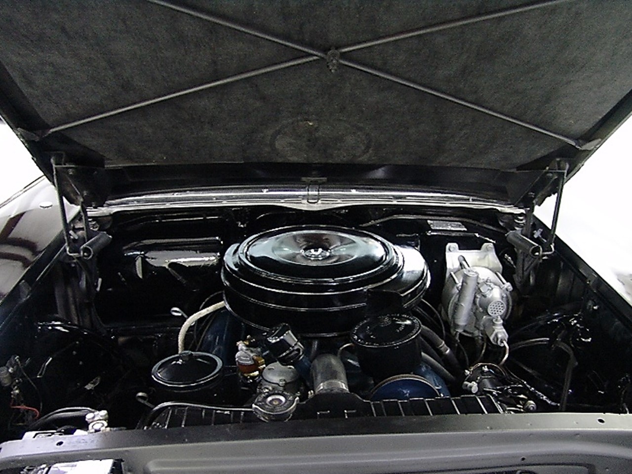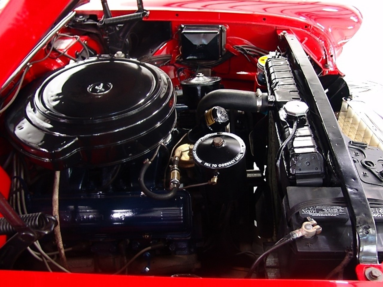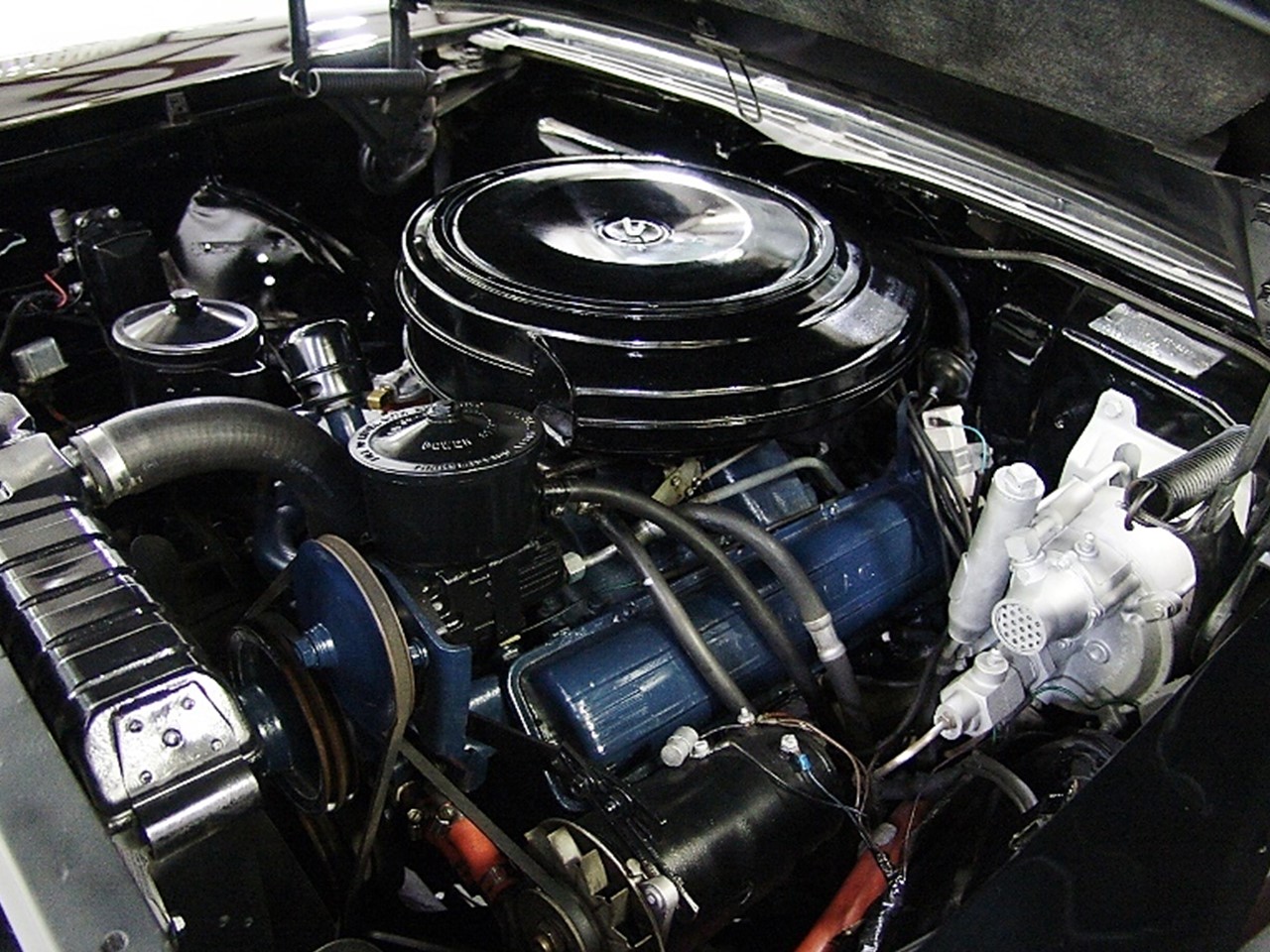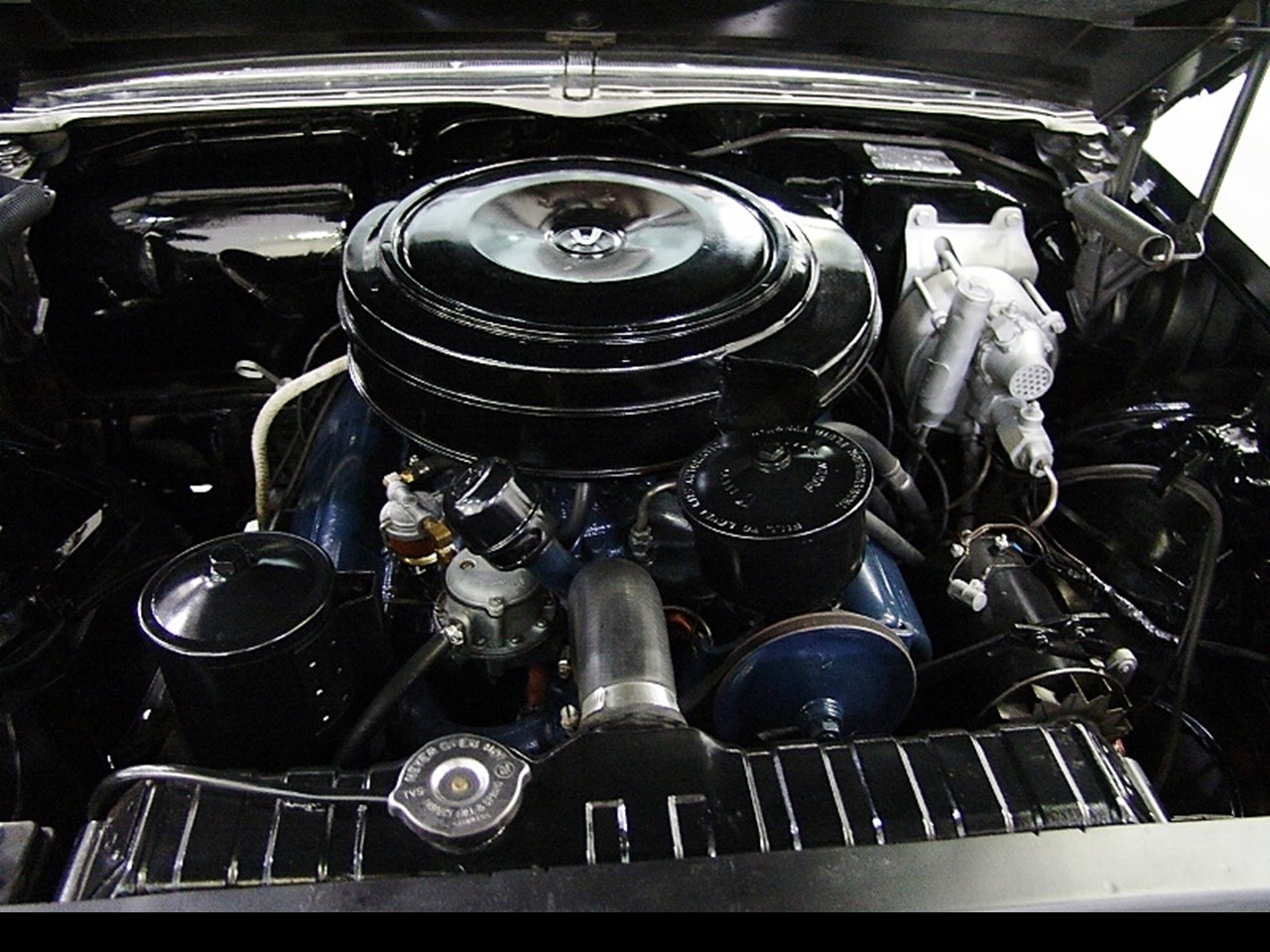 The notoriously reliable V8 under the hood used a full pressure engine lubrication system. Oil was pumped under pressure to overhead valves, crankshaft bearings, camshaft, con-rods, and rocker arm shafts. A jet of oil was pumped to the cylinder walls and piston pins.