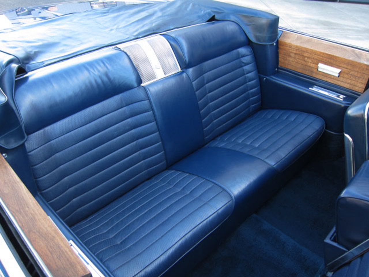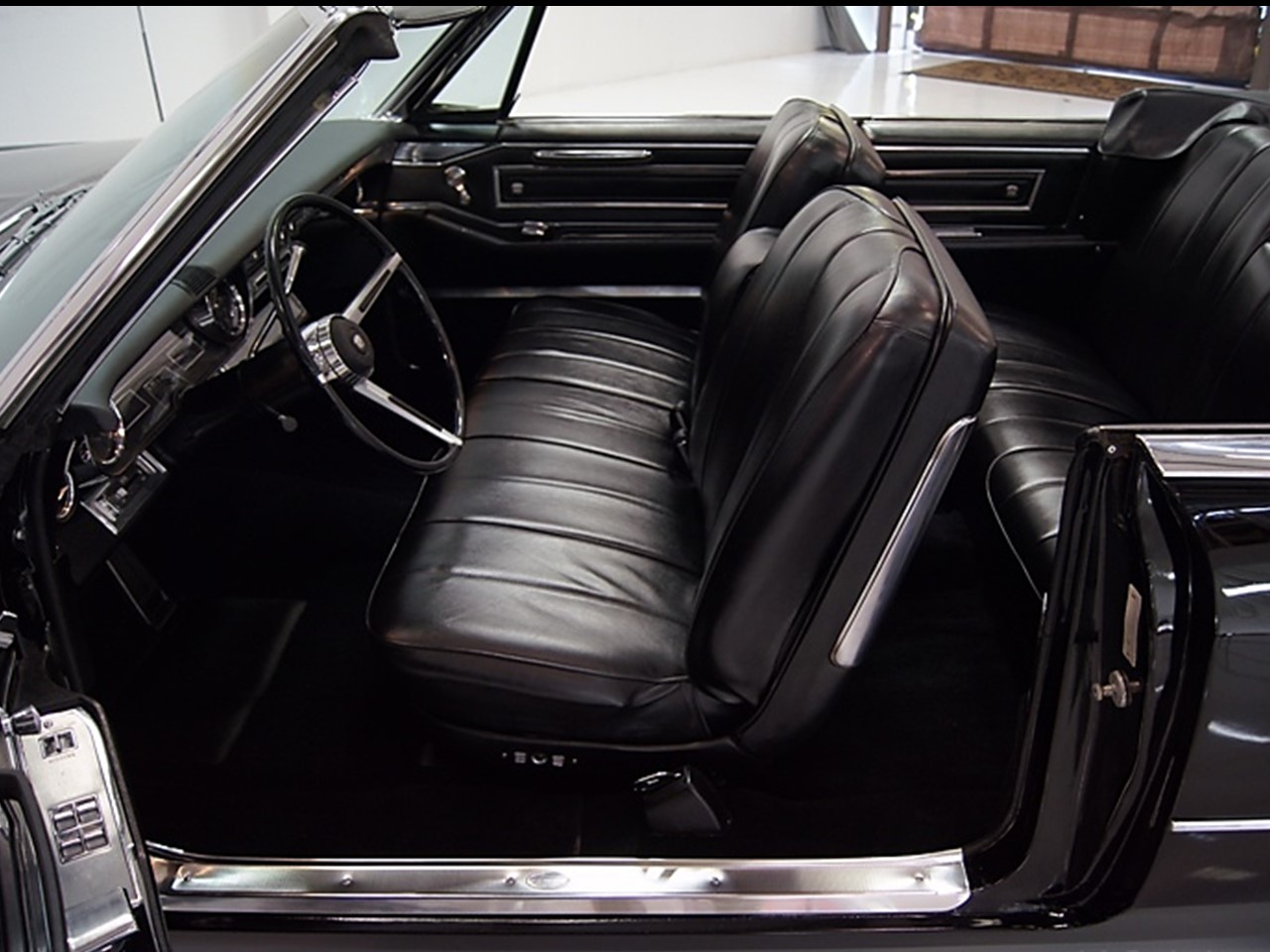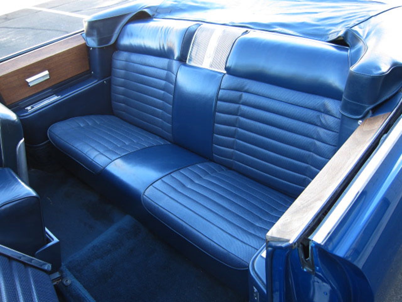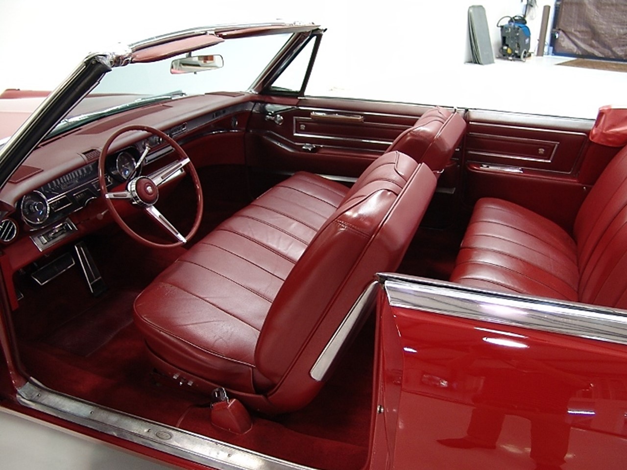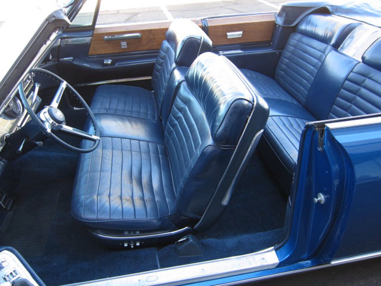The 1966 Cadillac DeVille convertible had an exclusive sew-style to the interior trim. It used wider and two less pleats than the closed DeVille models. A standard fully leather upholstered interior by Fleetwood augmented its youthful appearance. Front perforated leather bucket seats were optional at extra cost.