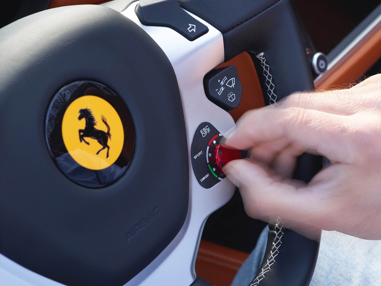 The suspension is tuned as an elegant grand tourer. It isn’t ‘severe’ it is designed to cosset its passengers. New low-friction dampers and additional sensors augment the refined magneto rheological fluid suspension. The springs are 12 percent stiffer than the previous model. Three vertical accelerometers improve suspension dynamics reaction time. The dampers react to rebound so fast that comfort and performance are enhanced. The California T exhibits very little body roll during cornering and negotiates uneven pavement in an extremely civil manner. The steering wheel mounted manettino has three suspension settings: Comfort, Sport, and ESC Off. There is no track mode and “wet” has been incorporated into the Comfort mode.