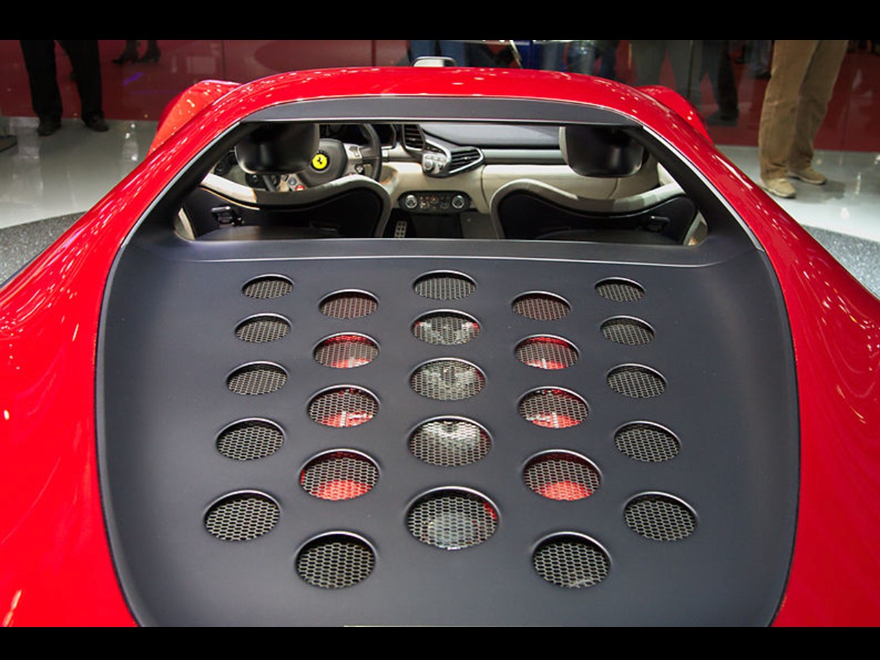 The circular taillamps not only represent Pininfarina and Ferrari heritage, they provide lighting and exhaust hot air from the oil coolers. Inherent Pininfarina DNA is evident in the rear bonnet. The iconic round graphic holes hint at legendary Pininfarina history and provide airflow to the engine compartment.