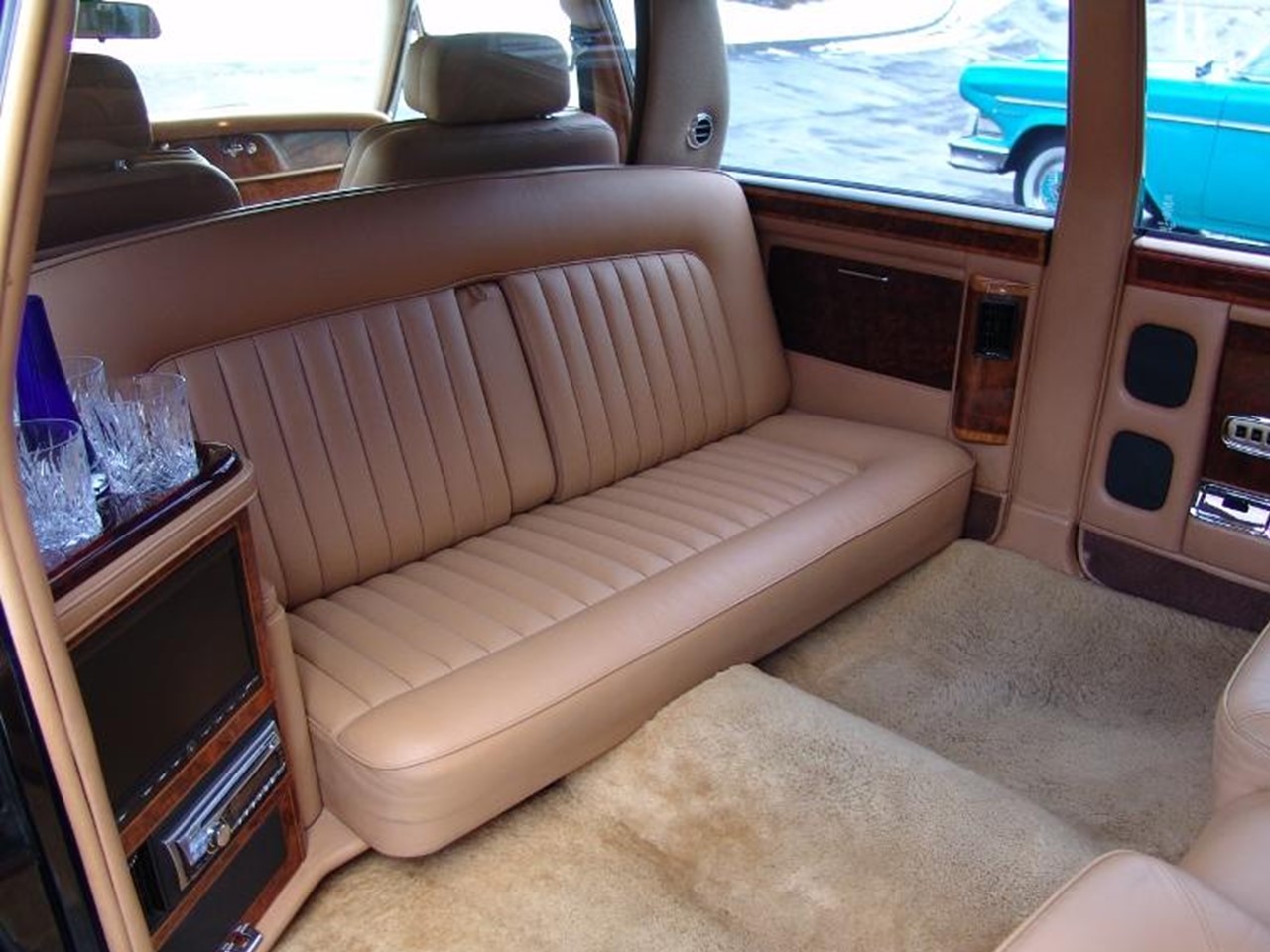 A burr walnut console houses the television, DVD, and concert hall quality audio system. A cocktail cabinet is recessed into the sides of the car which includes a cut-glass crystal decanter and glasses, and a refrigerator with separate compressor to properly chill food and beverages. A cell phone system is provided for both front and rear compartments.