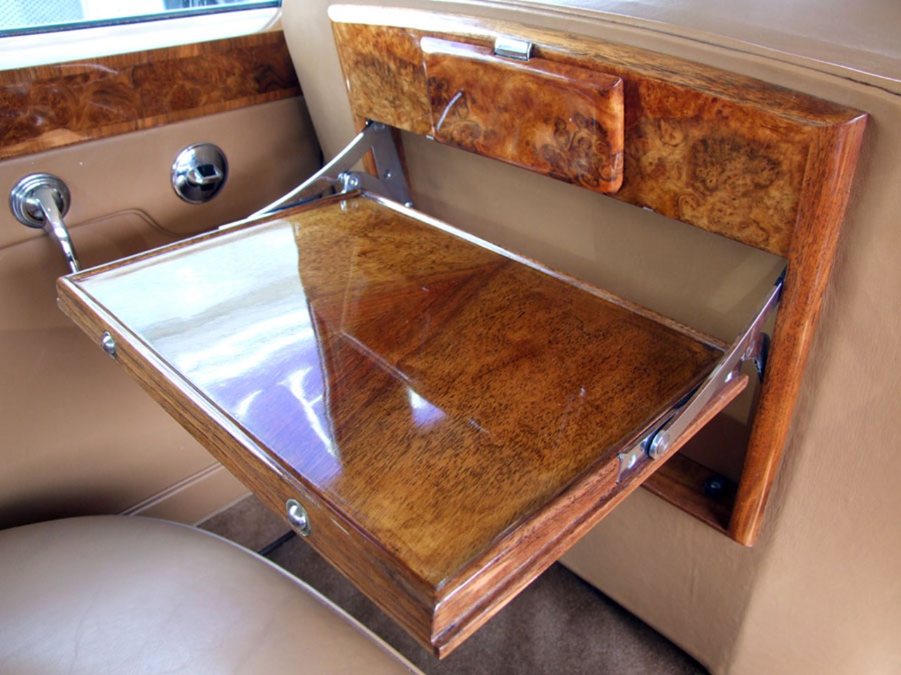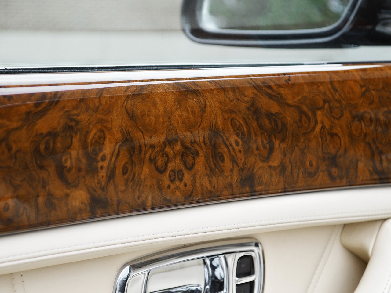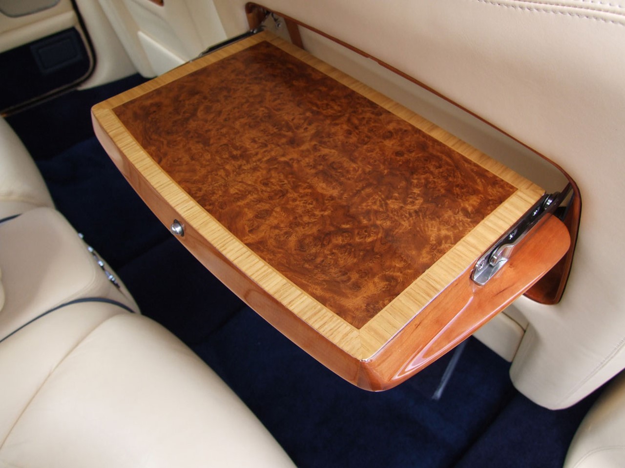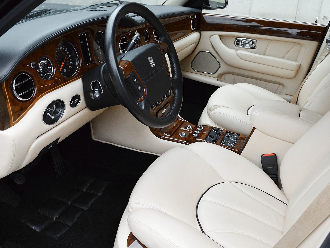 The luxurious ambience of the cabin reflects the formal aspects. Rich Connolly leather hand-crafted to perfection upholsters the seats, dash, and door panels. Mirror-matched wood veneers accent the dash and door garnish rails. No two veneer designs are ever alike, which is what makes a Rolls Royce unique. The carpet is hand-tufted and is made of 100% wool. It lines the cabin and the floor of the boot. There are carpeted foot rests for rear seat passengers.