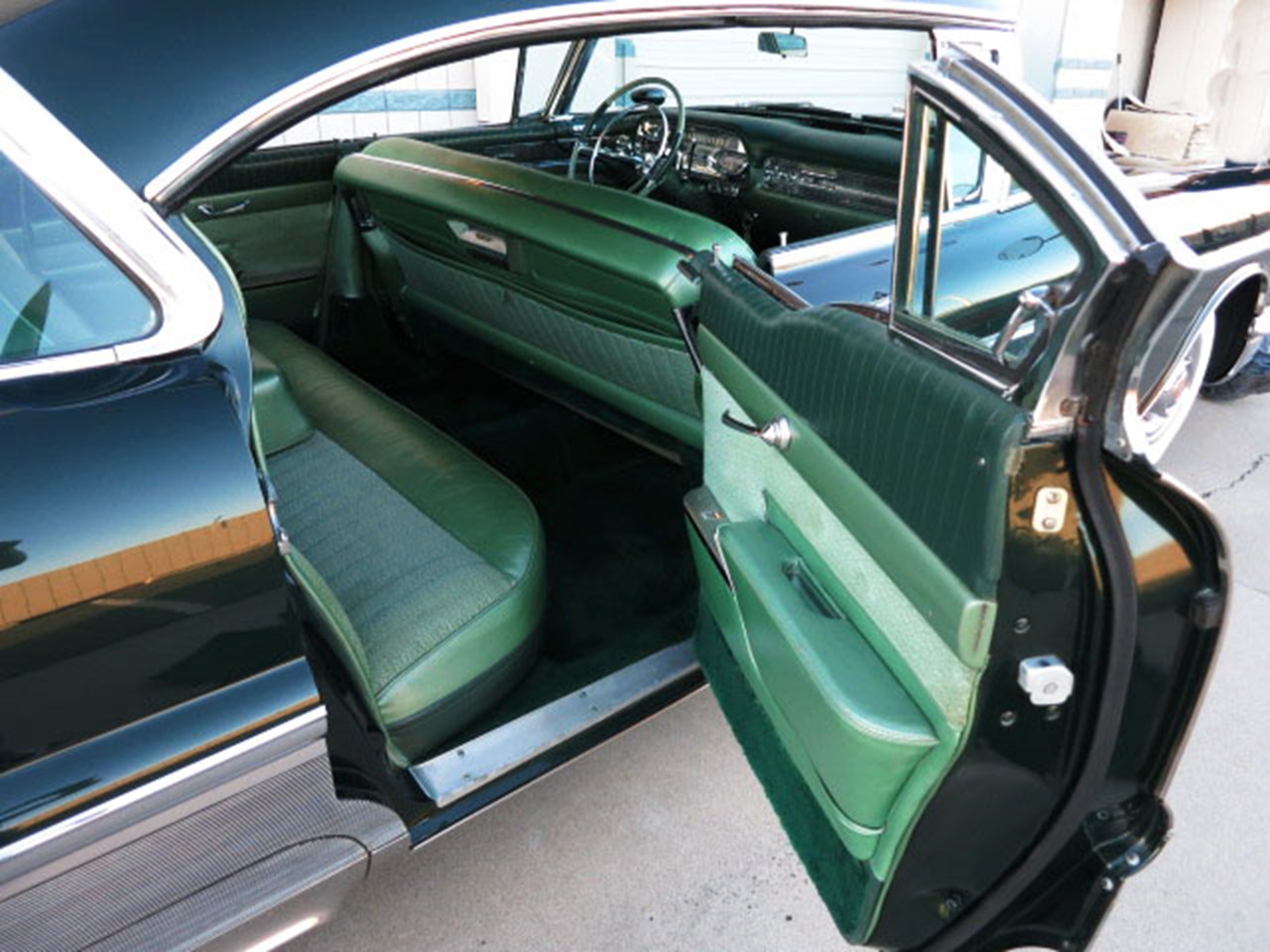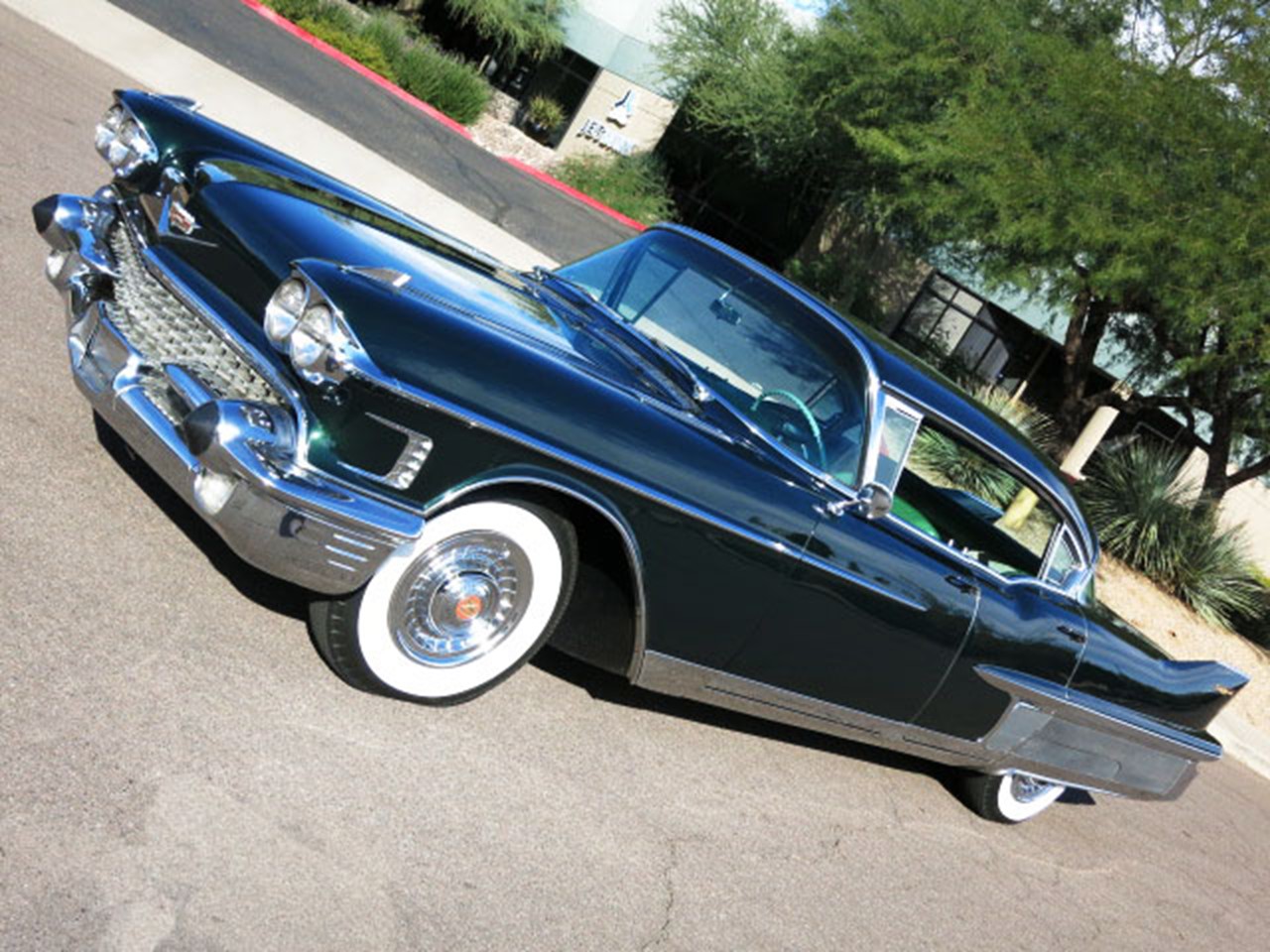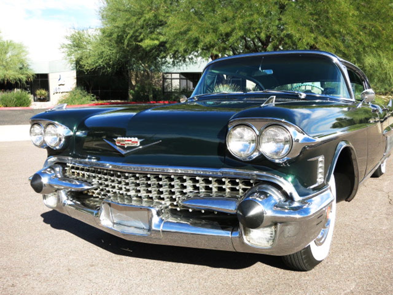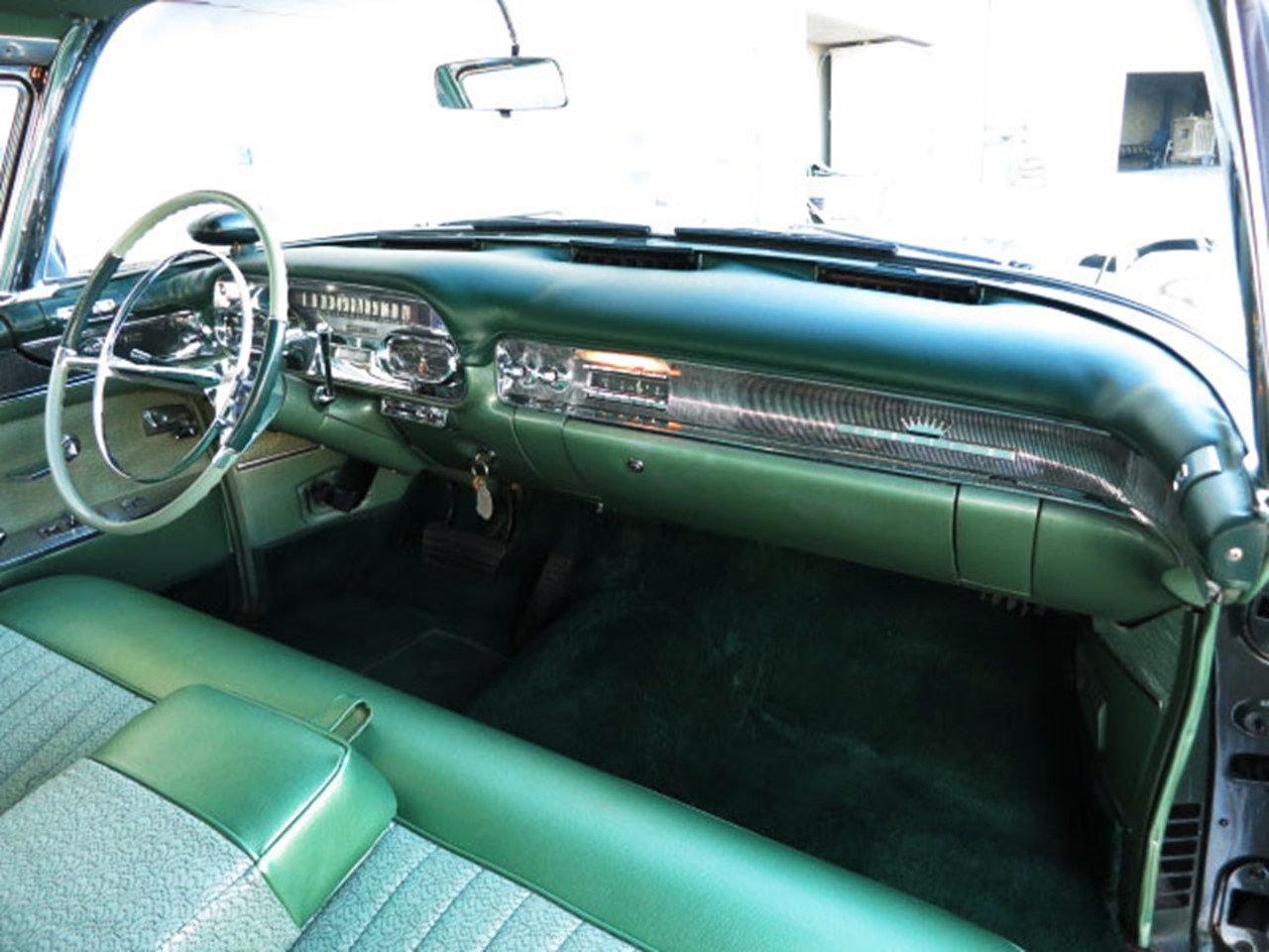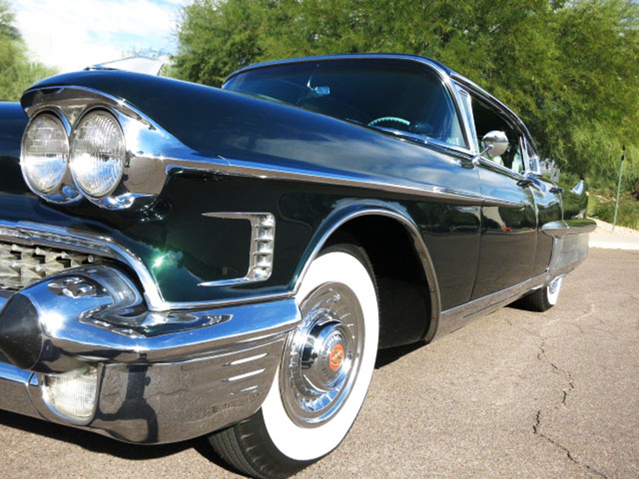 Standard Fleetwood luxury includes: front and rear center folding arm rests, power windows, power 2-way front seat, power vent windows, left and right outside rear view mirrors with driver’s side remote-controlled, and courtesy lighting. Popular options for the 1958 model year include: air conditioning, air suspension, power door locks, tri-power carburetion, automatic headlamp dimmer, Sabre-Spoke aluminum wheels (set of 5), gold-finish radiator grille, remote control trunk release, radio, and white wall tires.