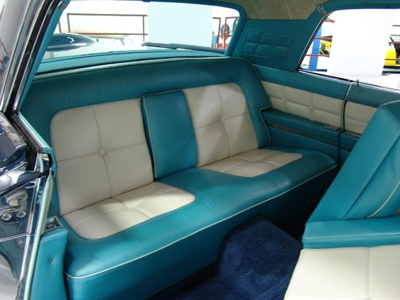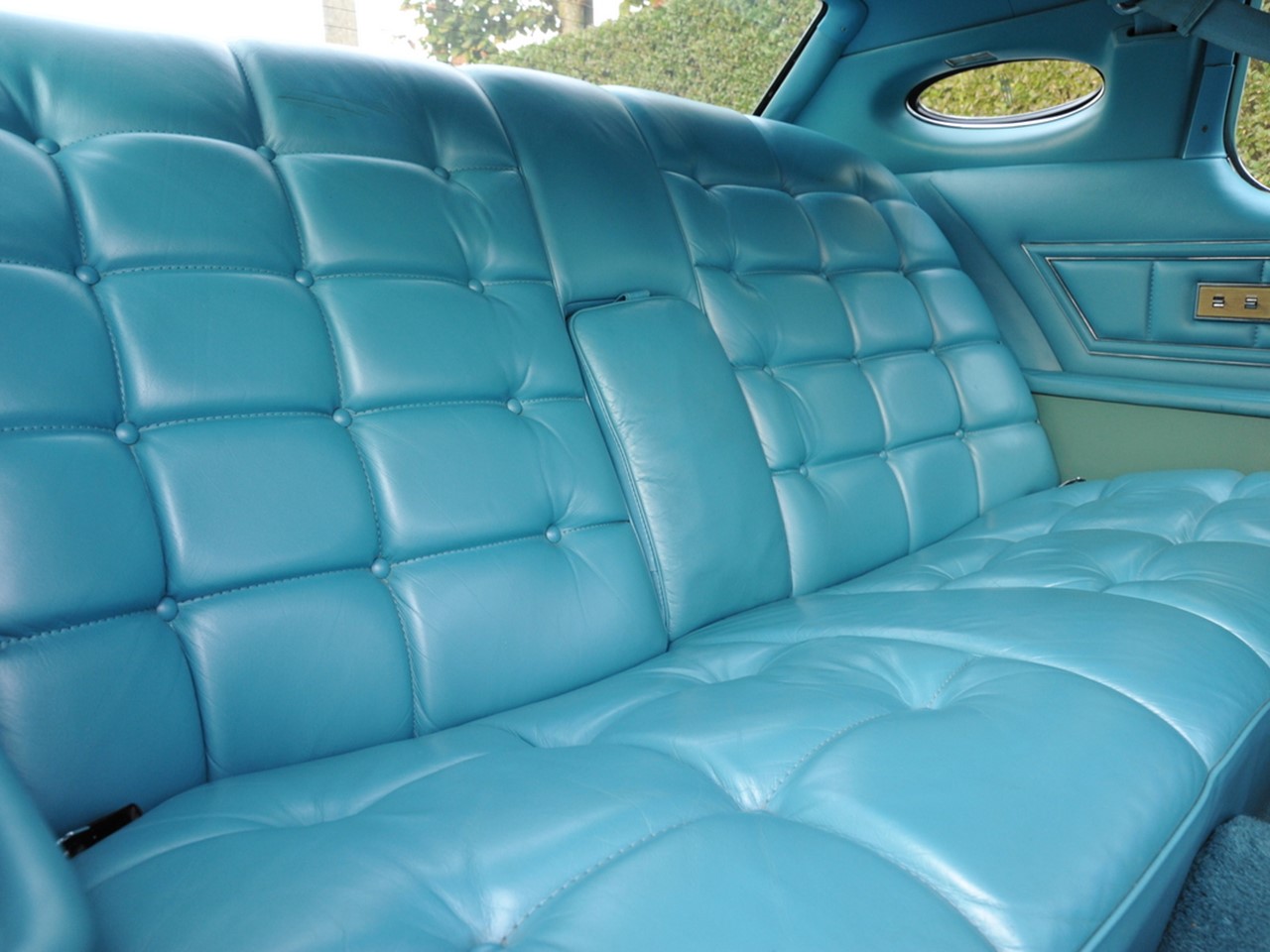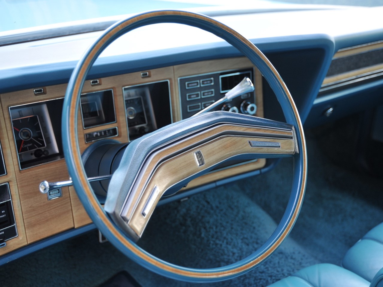 The Givenchy is finished in Aqua Blue Diamond Fire Metallic with a White Normande Grain vinyl landau roof. Black and White pinstriping is used to extend the color combination. White or Aqua Blue body side moldings allowed the buyer to blend or contrast the color combo. Aqua Blue Velour or Aqua Blue leather were the choices for the interior upholstery and trim. The dash was highlighted by light simulated wood grain with black-grained inserts. This Designer Group was $1,500 extra for both velour and leather choices. Huber de Givenchy used his talent also for the 1977-1979 MK V.