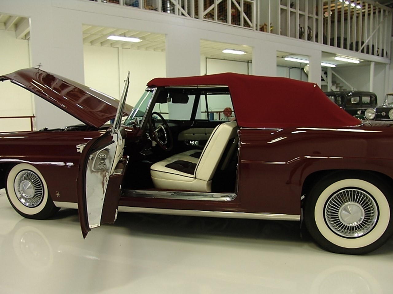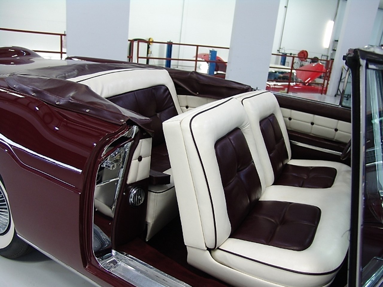 Collins Trim and Auto of Marion, Indiana hand-crafted six Continental MK II conversions in the 1990s. The original convertible was built by Derham Coachworks of Rosemont, Pennsylvania in 1956 as a prototype. The custom Carson-style top has extra wide rear sail panels. The roof augments the classic silhouette of the Continental MK II. The car’s original “cow-belly” frame is well suited for this type of conversion because of its deep-seated, more upright construction with a lower silhouette. The cow-belly design required the use of a 3-joint driveshaft and a higher transmission tunnel inside the car. Had production commenced for this body style, the price would have exceeded $18,000 –