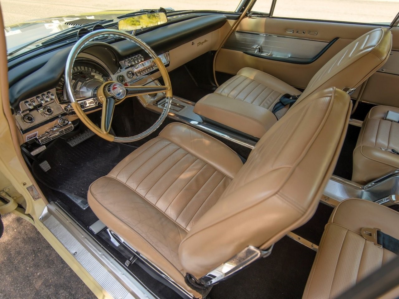 The exclusive four seat interior is built with a futuristic look. The dash reminds me of “The Jetsons.” It features the exclusive to the industry “Panelescent Lighting System” which back-lit the controls creating a floating effect. This was Chrysler’s new breakthrough in automotive lighting eliminating the conventional incandescent bulbs. It was introduced by Sylvania Lighting Products on September 8, 1959. It gave the instruments a soft glow.