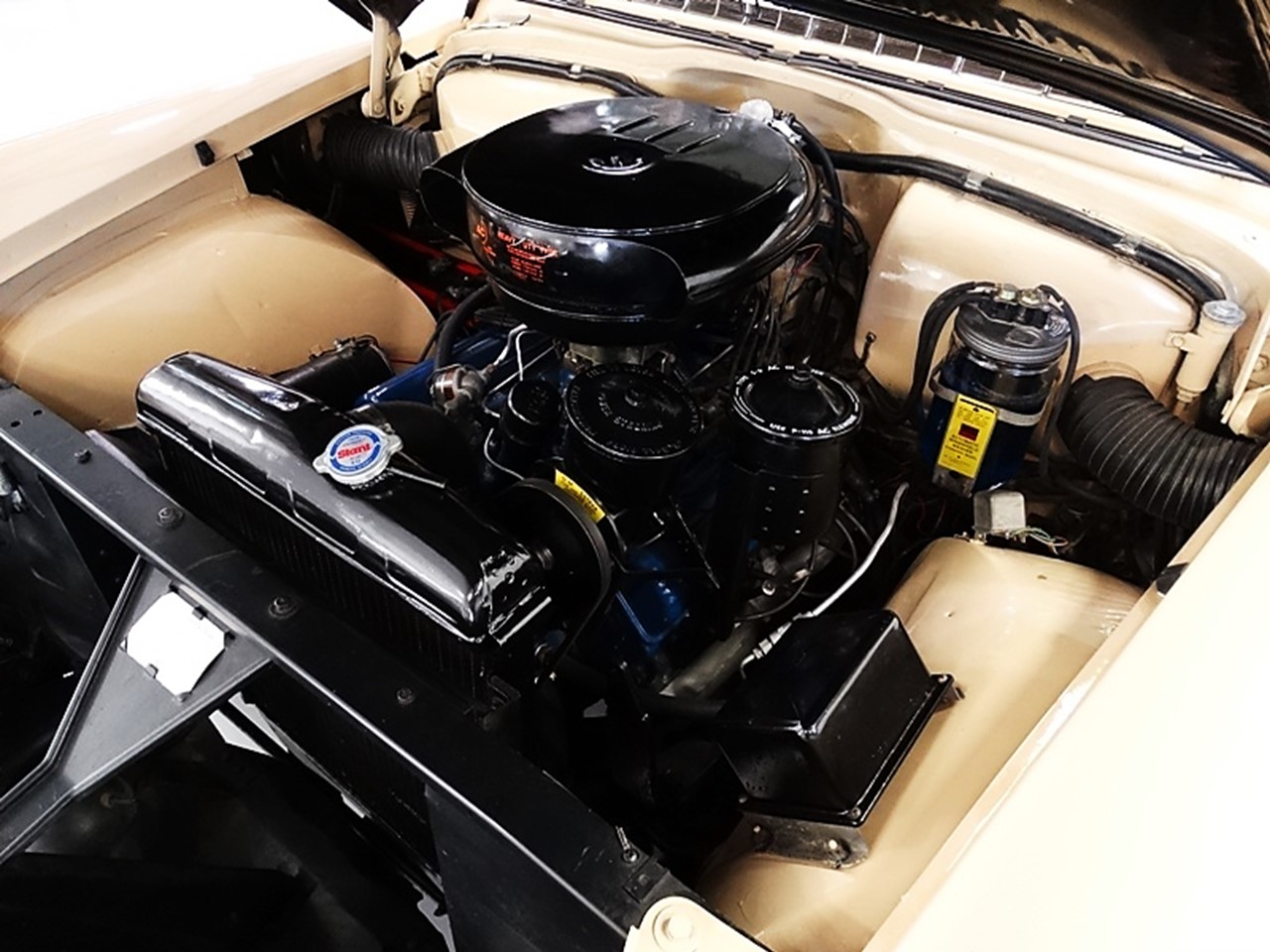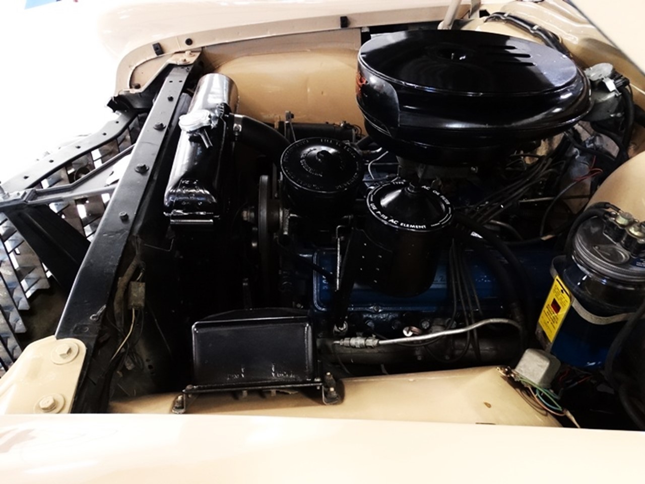 The 1955 Series 62 Coupe deVille is powered by Cadillac’s 5.4 litre 16-valve 331 CID V8 engine. Among its highlights is a new combustion chamber, a higher 9.0:1 compression ratio, new valve linkage which improves breathing efficiency, and increased torque-thrust. The engine is built with a cast iron block and cylinder heads, and it runs in five main bearings. Two 4-bbl carburetors were available: a Carter WCFB 2185S and a Rochester 4GC 7007970 (7007971 w/air conditioning).