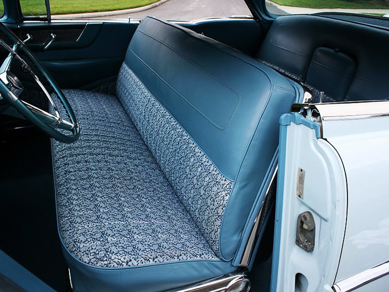 The 1956 Series 62 Coupe deVille is an eminent realm of motoring majesty. It has all the virtues that make a Cadillac a Cadillac. The luxury is evident in the richness of its exclusive interior appointments. A large folding center armrest is standard for rear seat passengers. Its pillarless hardtop design lends an airy touch with excellent all around visibility. With its extraordinary exclusivity and supremacy in a luxury motorcar, there was no more exciting manner in which to experience Cadillac and style. In addition to the luxurious leather upholstery, handsome Bombay or Stardust metallic nylon with leather bolsters was also available.