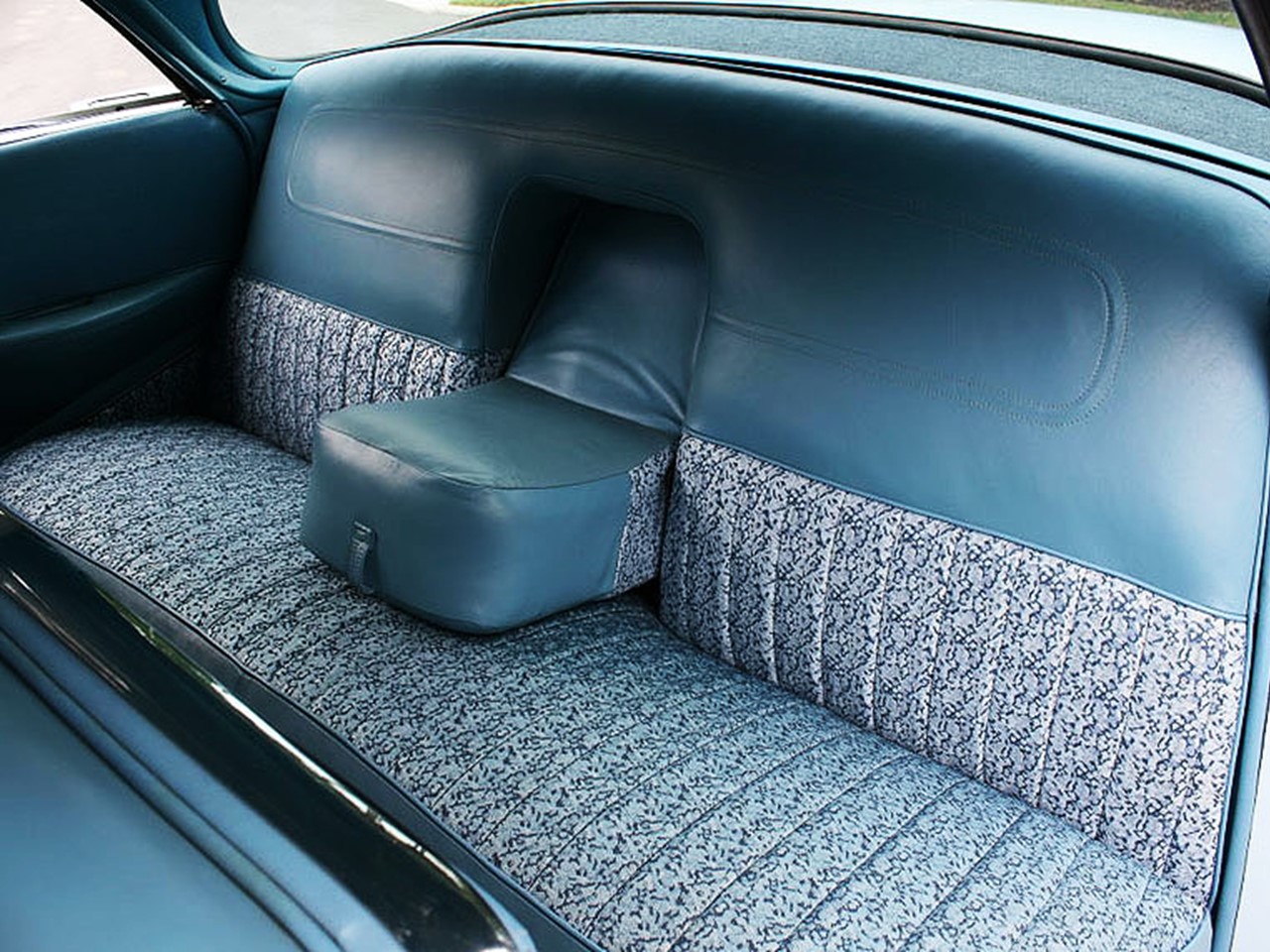 It is General Motors that introduced the hardtop coupé to the American highways. This distinctive design was unveiled at the 1949 Motorama along with the Oldsmobile Futuramic 98 Holiday hardtop coupé and the Buick Roadmaster Riviera hardtop coupé. It is a look that no other car had ever offered…it mocks a convertible with its roof raised. The interior has chrome bows as part of the headlining to simulate convertible hardware, sumptuous leather upholstery like a convertible, and power windows. Cloth with leather upholstery became available for later model years.