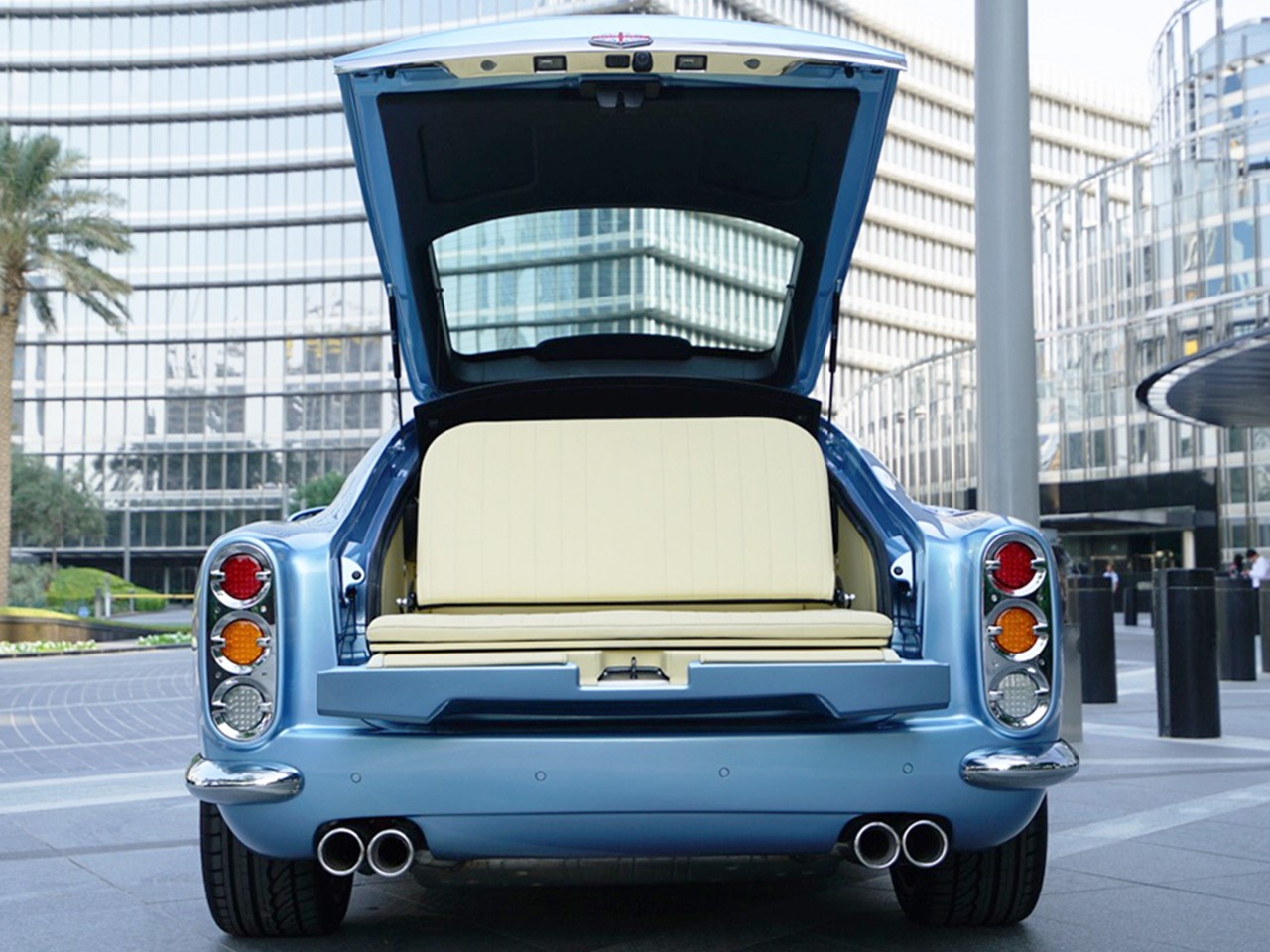 A truly unique feature is the tailgate which opens out as a picnic seat. The lift back hinges upward and a valence drops down into a horizontal position as that of the Range Rover. This type of embellishment is reminiscent of the Harold Radford Countryman crafted to suit the rural lifestyles of the landed gentry.
