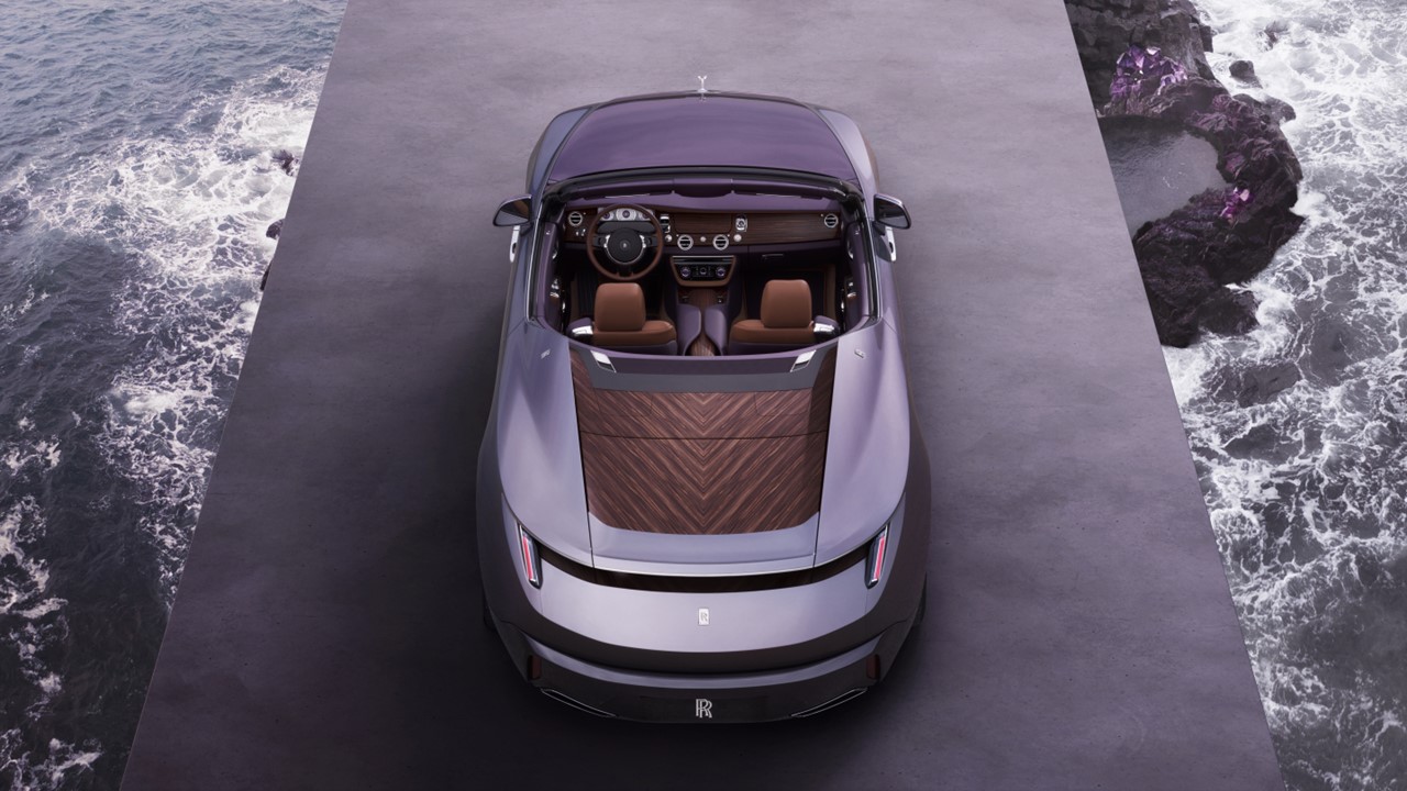 Amethyst Droptail can be either an exotic open tourer or install the hardtop and it becomes an elegant closed coupé. The roof has electrochromic glass that not only changes color but also transparency instantly. Rolls-Royce Bespoke Collective designed the glass to be completely opaque with a subtle purple tint mirroring the car’s Amethyst color bodyshell when deactivated. At the touch of a button, it becomes translucent – with a hue that matches the ‘Sand Dunes’ leather color of the interior. It required specialists to experiment with 60 iterations of glass coloring before the perfect match was found.